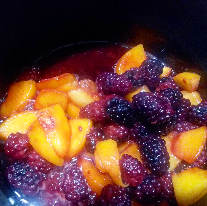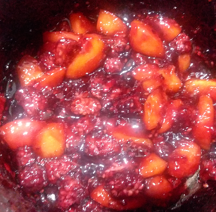 2.) In a pot, cook the blackberries, peaches, and lemon juice until the fruit starts to macerate (about 5 min).