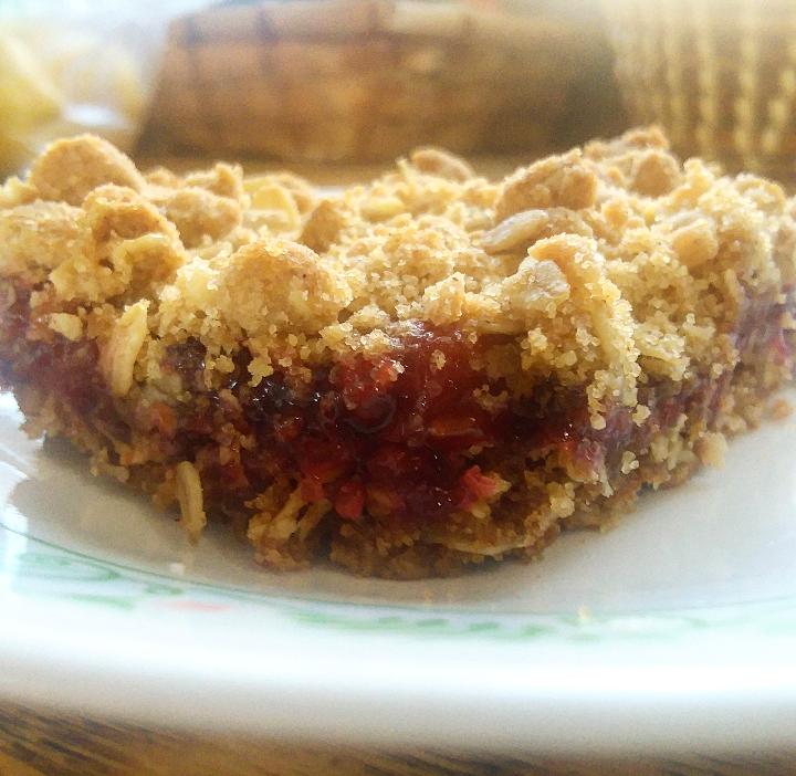 Many years ago my mother was given a recipe from a merchant at our local Farmer’s Market. It was for strawberry rhubarb granola bars. Initially I just wanted to veganize that recipe, but I ended up taking it in a bit of a different direction all together. Regardless, it remains the initial inspiration to what you see here. In a perfect world I would have fresh fruit from that very same Farmer’s Market, but alas it’s too early for that. I can’t even find fresh peaches in the grocery store, so I’m stuck using frozen ones. Try as it may, I refuse to let the world keep my crumble and me apart. It’s been cold and snowing a lot the past week or two, so I’ve been making gallons of lemonade in a desperate attempt to feel like it is actually Spring. If I’m going to do all that I might as well indulge in some other Spring treats too, right? Right.