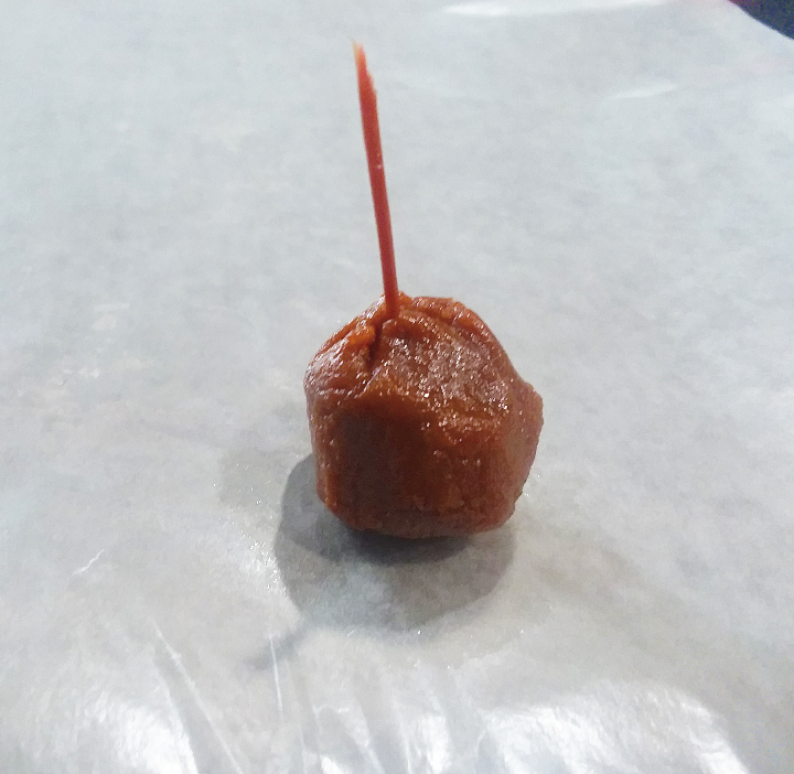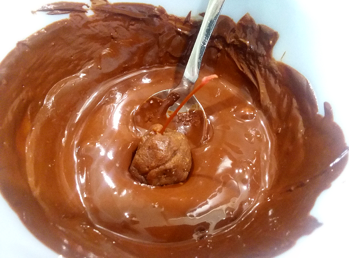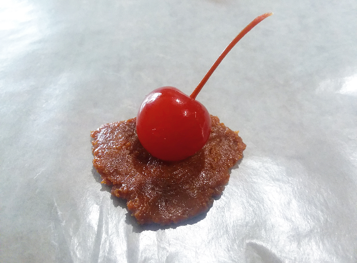 3.) Find a plate or cookie sheet that can fit in your freezer and cover it with wax paper. Take a section of the cookie mix and flatten it on the wax paper. Place a cherry in the center and lift up the edges of the cookie mix until it envelopes the cherry. You should be able to create a cohesive shell of dough. (Obviously if you use a lot of dough per cherry, you’ll be able to make fewer chocolate covered cherries in the end.)