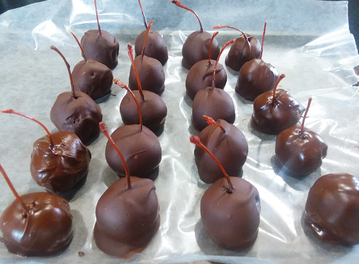 4.) Once all the cherries are covered, put them in the freezer until set. I left them in for an hour.