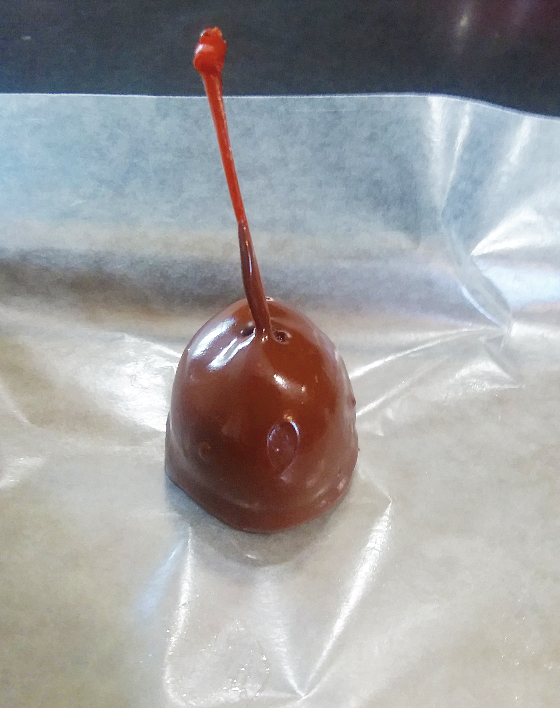 6.) Dip the cherries into the chocolate. I recommend using a spoon to help coat and support the weight of the cherry in order to avoid the stem getting pulled out. Place them back on the wax paper and pop them back in the freezer to set (another hour or so).