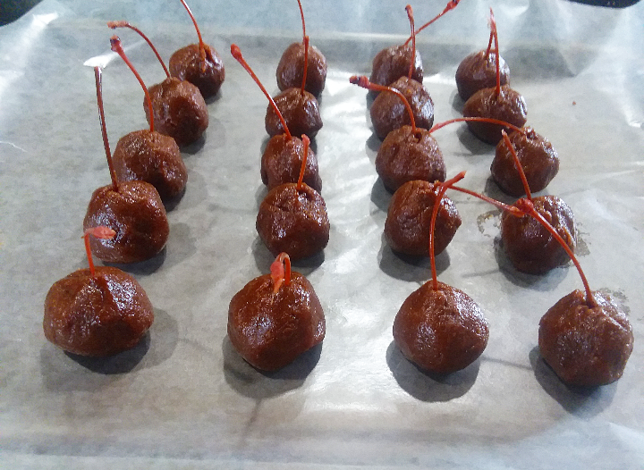 ***If you find that the dough is sliding off the cherry, your cherries may be too wet. I also wiped off my hands occasionally to prevent them from sticking to the dough.***