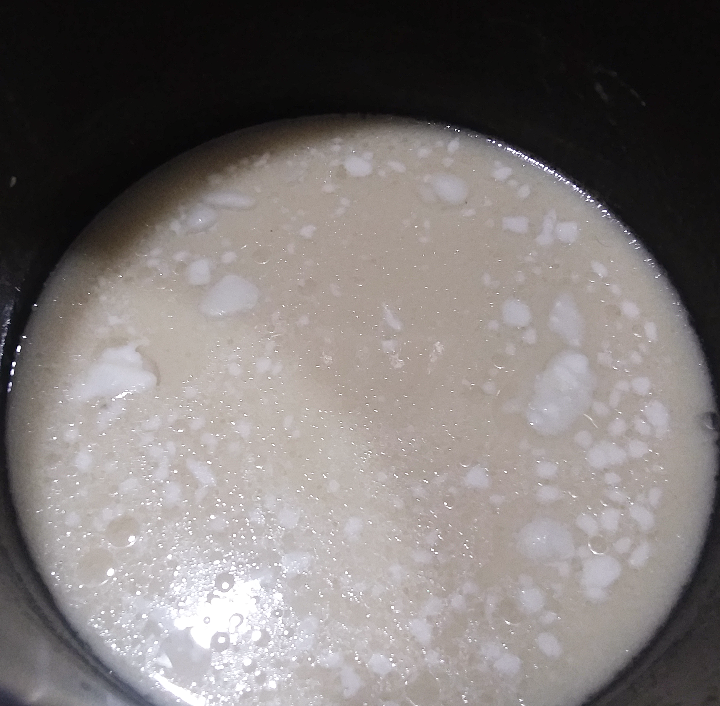 1.) Heat your coconut milk and maple syrup over medium heat until it starts to boil. Turn down the heat to simmer for about 20 minutes, stirring regularly. You want the mixture to thicken slightly, but not reduced even by half. I found trying to replicate the texture of condensed milk left the final product too thick and grainy. The mixture will continue to thicken a bit as it cools, so allow it to return to room temperature before proceeding.