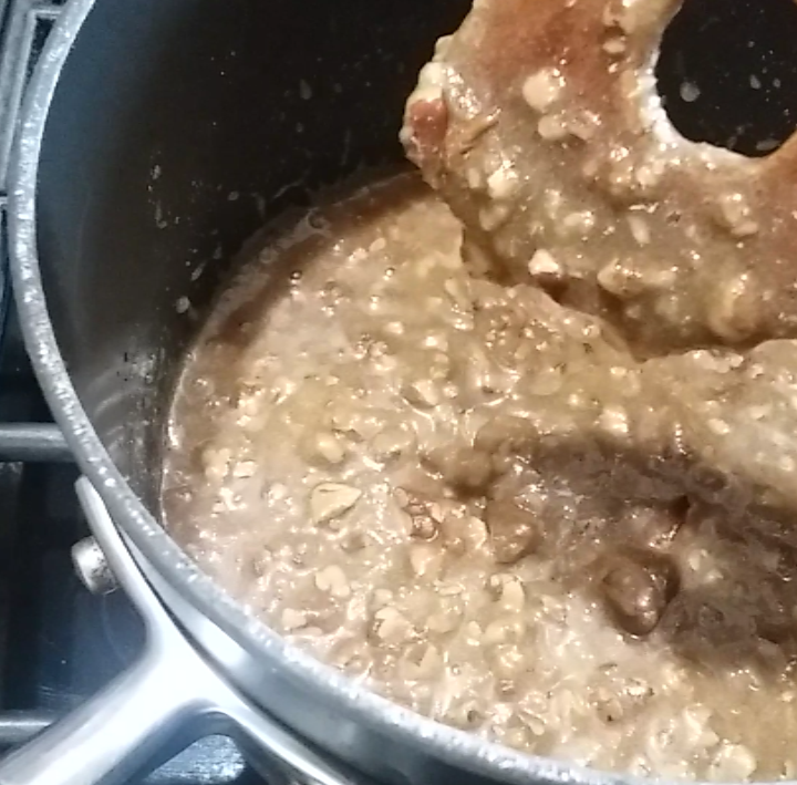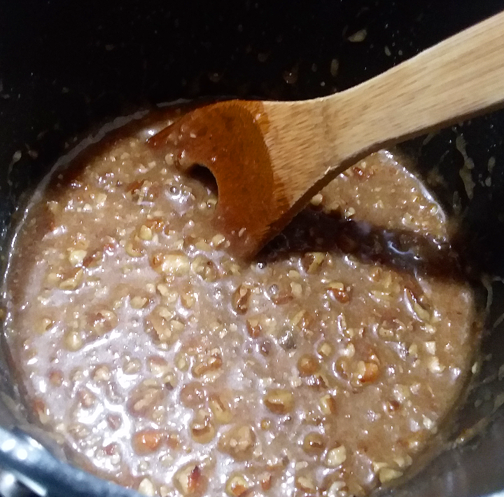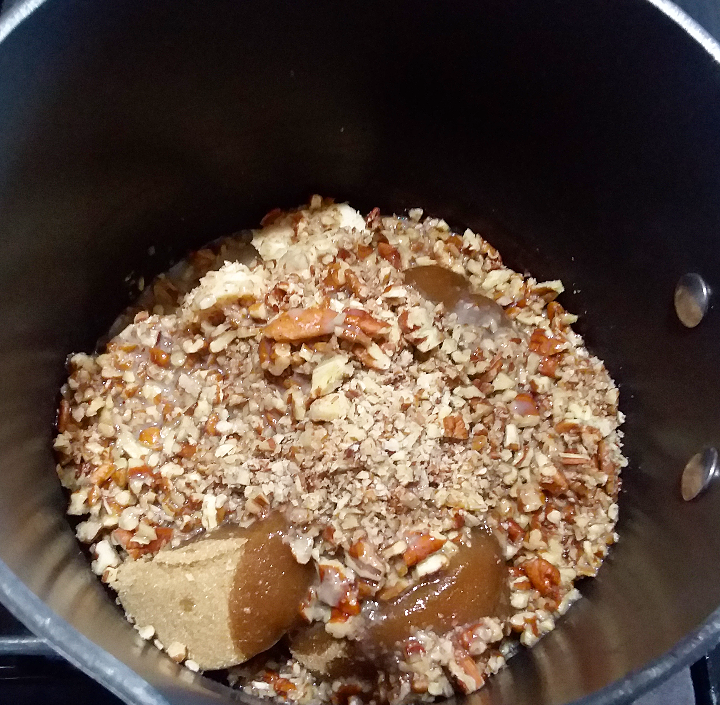 4.) Combine the pecans, both sugars, salt, and butter in a pot over medium heat. Start by adding 1/2 c. of the coconut milk mixture. Stir the mixture until the butter melts. Drizzle in more of the coconut milk mixture (about 1/8 cup) to thin it out. The consistency of the mixture should coat your spoon and slowly trickle off. (If your considering skipping the thinning step so that it’s thicker and you don’t have to stir later on, I must discourage you. Your final product will still taste good, but it’ll have a gritty texture, which is not what we’re going for.) Attach your candy thermometer and stir the mixture very regularly until you hit 238 degrees aka soft ball stage.