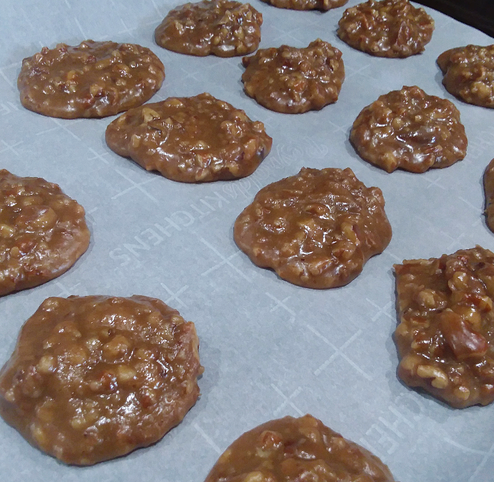 6.) If your not sure if the mixture is ready, take a cookie scoop or small measuring cup and pour a little bit of the mixture onto the parchment paper. If the pecans are grouped in the center and the liquid spreads out then it’s not ready. You do want to scoop the mix out before it gets too thick otherwise you’ll have a hard time getting it out. You want to scoop it out easily, but not have it run everywhere once it’s on the paper.